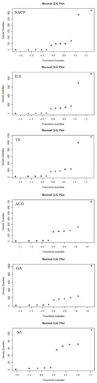 For conducting the statistical analysis, both data normality and homoscedasticity are first verified. Figure 10 presents the normality of the data of each algorithm. The results show that there is no normality in the data of any algorithm since the points are not located on the diagonal of the graphs.
