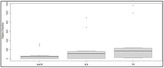 The homoscedasticity analysis for SACP, ILS and TS for the same number of data is performed graphically with the boxplot. Figure 11 shows that the boxes are not the same, since there is a greater dispersion of data in the TS box, and ILS follows and, finally, the least dispersion has SACP. TS presents the greatest variance and SACP is the one that has the smallest variance of the three algorithms. Therefore, a common variance cannot be admitted. It indicates that there is no homoscedasticity between the three algorithms. Applying the Bartlett test with the Bartlett-test function of R [44], the p-value = 0.001169 is found (0.001169 < 0.05), this shows that there are different variances; therefore, it is confirmed that there is no homoscedasticity when having a small p-value.