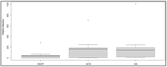 The homoscedasticity analysis for SACP, ACO and GA for the same number of data is performed graphically with the boxplot. Figure 12 shows that the boxes are not the same, since a greater dispersion of data is observed in the ACO and GA boxes and the lower dispersion is presented in SACP. SACP is the algorithm that has the least variance. Therefore, a common variance cannot be admitted, which indicates that there is no homoscedasticity. Applying the Bartlett test with the Bartlett-test function of R [44], the p-value = 0.002409 is found (0.002409 < 0.05), this shows that there are different variances; therefore, there is no homoscedasticity when having a small p-value.