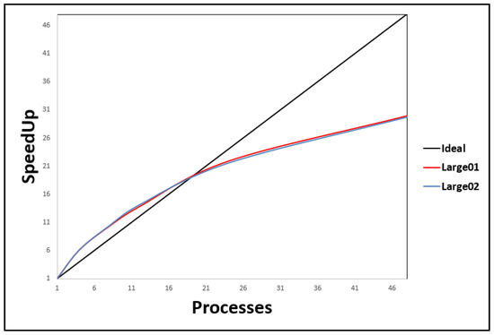 Figure 15 presents the efficiency of SACP evaluated for large instances. It can be seen that, up to 21 processes, efficiency presents a superlinear speedup above the ideal. This is because the first 12 processes in SACP are executed on a single node of the computational cluster and does not require communication with the other three nodes of the cluster. From 21 processes onwards, efficiency begins to decrease considerably. This is due to two things. First of all, that communication between nodes is performed with an Ethernet 100BASE-TX, 100 Mbs connection, which slows down the sending of messages from SACP between nodes. Second, that SACP carries out cooperation between processes, which implies that in each iteration there is always communication between all the processes that are executed at all nodes of the cluster, applying collective communication and point-to-point communication.