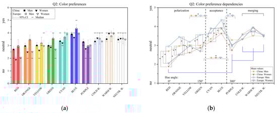 For both groups, the first two color topics about preference and moods, by sorting the colors according to increasing hue angles, we were able to achieve synchronized tendencies within origin and gender. As with the Geneva Emotion Wheel [45,46], it might be possible by more detailed research to create a vehicle-mood color wheel including at least origin and gender in-wheel selections.
