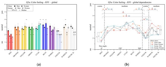 (a) Color-joy rating and (b) statistical evaluation separated between Chinese and European participants and genders. Statistical significances p < 0.05 marked with *.