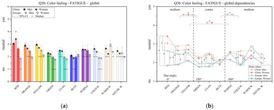 Compared to the other two feelings, joy and fatigue, there are controversial ratings between origin and gender observed. The highest attention level was achieved within the red and orange group for the English survey participants. Within the Chinese participants, the color blue was rated as the color with the highest attention potential. Significant differences for red within the Chinese participants were calculated as z = 2.17, p = 3.00 × 10−2 and r = 0.17 indicating a weak effect power. Between Chinese women and English men as, z = −4.87, p = 1.21 × 10−6 and r = 0.48 indicating a medium effect power.