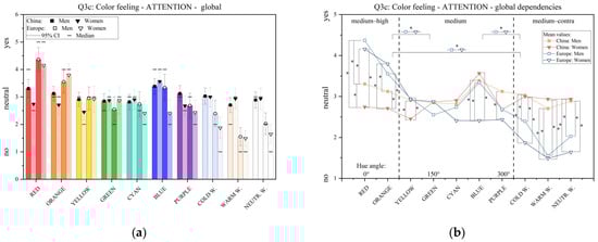 (a) Color-attention rating and (b) statistical evaluation separated between Chinese and European participants and genders. Statistical significances p < 0.05 marked with *.