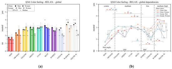 (a) Color-relax rating and (b) statistical evaluation separated between Chinese and European participants and genders. Statistical significances p < 0.05 marked with *.