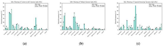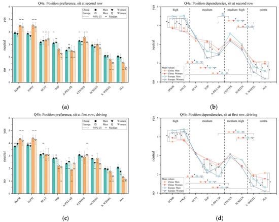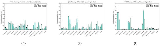 The answers to the quantitative questions 1 and 2, see Figure 10a–d, continue to support that there are expected differences between male and female priorities for the future automotive iVLS. Women focused more on safety or practical reasons, whereas men concentrated more to follow the trend of fast-forward. From a sociological point of view, we know that women primary looking for more stable conditions and men have more tendencies for risk orientation although the latest studies evaluated this long clientele in a different way based on modern risk definitions [48]. Anyway, this more stable controlled and orientated female setting was also observed for mentioned color-mood group like connecting a nice atmosphere with a warm-white color, see Figure 10b.
