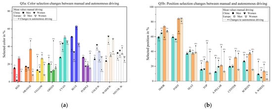 There were no differences observed between lighting positions if the context changed from the second row to the first row. Within both settings, the foot and the door area followed by the center, seat and screen area were highly rated within both genders and origin groups. Other studies confirmed the higher rating for the door position adding interpretation of a more luxury feeling, an activating effect and better perception of the vehicle interior in the door illumination context [9]. They found a worse rating for the foot area as less pleasant and less comfortable, which are opposite results compared to our study. In a recent study, foot and door in-vehicle lighting collected the second and third highest ranking after lights for reading purposes, which supports our findings as well [47]. By using iVLS for information transmission as iVLSa, the centralized dashboard position was assumed as a preferred position by 58 participants from Germany with no gender or statics information [24]. Differences between autonomous and manual driving are major observed for the lighting positioning selection, in which for the vehicle self-driving mode, most subjects preferred more light at more in-vehicle positions. Within the colors, there were more subjective changes observed, see Figure 8a,b.