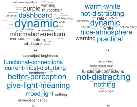 Word cloud results displayed for Q1 as “Which light system do you want to have in your future vehicle?” in (a,b). For Q2 as “If you don’t like your current interior lighting in your vehicle, which proposals you have to improve it?” in (c,d). Results are separated by genders globally. Amount n of participants for each question: (a) male answers with n = 59; (b) female answers with n = 47; (c) male answers with n = 36; (d) female answers n = 25.