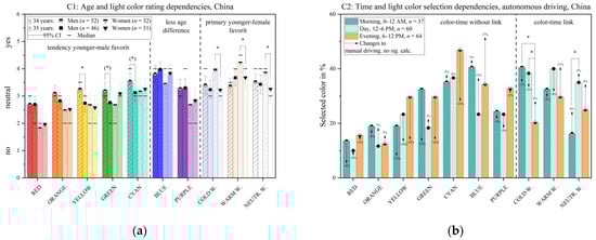 Within the Chinese participants only: (a) age and light color preferences; (b) time of the day and color selection dependencies; including statistical evaluations with significances p < 0.05 marked with * or for p ≤ 0.06 marked with (*).