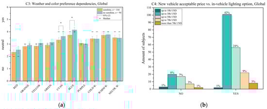 Significant differences within all participants globally regarding the weather settings were also identified, as shown in Figure 12a. Cyan and blue colors were more selected during no-sunshine settings compared to sunny days, with a weak effect size of r around 0.14–0.23. Last, there was a considerable support for in-vehicle lighting identified within all participants globally. In Figure 12b, 79% of all participants wanted to have an interior lighting system in their new vehicle as presented in this online survey. Most of them already in moderate vehicle price classes. Detailed statistics for the combined results are added in the Supplementary Materials of this study, Section S3, Tables S13–S15.
