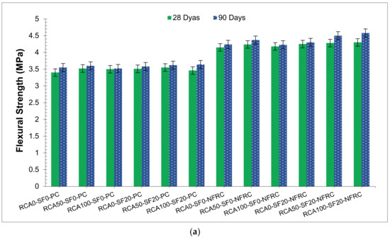 Figure 6a shows relative analysis of flexural strength of concrete samples cured at 28 and 90 days of age. A relative analysis is performed on concrete samples to show that how much its performance is improved concerning the control sample. From the figure, it can be concluded that nylon fibers reinforcement played a significant role in improving concrete flexural strength. It can be observed that the joint effect of nylon fiber and silica fume accumulation can ascribe more to the concrete mechanical strength as compared to their individual adding of each component in concrete. Such as RCA0-SF20 and RCA0-SF0-NFRC samples have 4 and 19% more flexural strength at 90 days of curing as compared to reference concrete samples. While RCA0-SF20-NFRC has 26% more flexural strength as compared to the reference sample. Hence, the effect of joint utilization of silica fume and nylon fibers leads to more strength gain in flexural capacity.