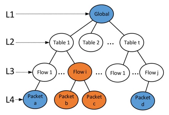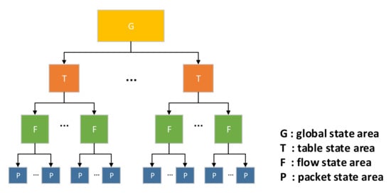 MSSA is a state-storage hierarchical tree structure. The MSSA structure has four layers, as shown in Figure 2, namely the global state area, the table state area, the flow state area, and the packet state area, where the state area is a sub-unit that records the state. In order to classify state areas, each state is assigned a specific sharing scope, and all of the states in the same state area have the same sharing scope.