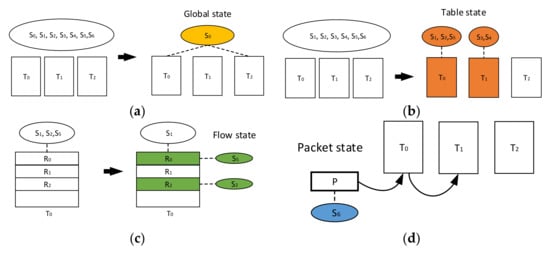 Figure 3. Fine-grained state division via a multilevel match–action table structure. (a) global state; (b) table state; (c) Flow state; (d) Packet state.