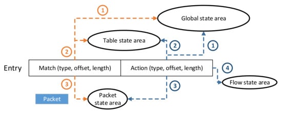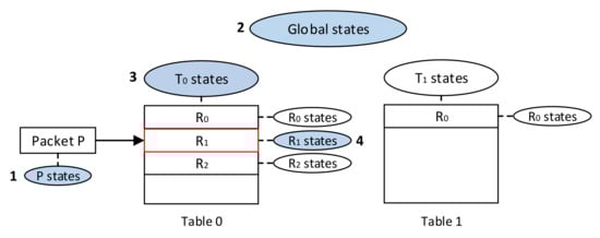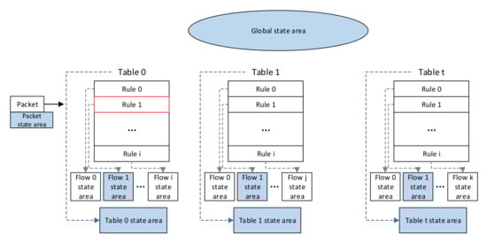 Although the switch has 1 + t + i = 0 t f i + i = 0 p P i state areas at time T, the packet processing state can only be in four state areas at most. Because the number of states that can be stored in each state area is limited, constant-time state lookup is possible. By the shared scope of the state, there can be only four state areas needed in packet processing. When a packet matches an entry, it can only access the following state areas: the packet’s packet state area, the matching entry’s flow state area, the entering table’s table state area, and the global state area (as shown in Figure 6). The state required by the packet will then be limited to these four states. Obviously, the limited state areas can only be determined after the packet matches the entry. As stated in Section 2, the switch processes packets by using a match–action table. Moreover, matching the packet to an entry is a switch-inherent process.