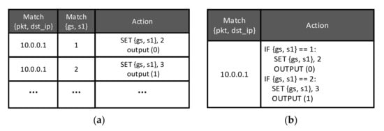 Figure 13. Two state-comparison methods. (a) Compare state with match fields. (b) Compare state with actions.