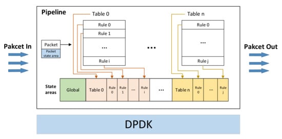 28. Pontarelli, S.; Bifulco, R.; Bonola, M.; Cascone, C.; Spaziani, M.; Bruschi, V.; Huici, F. Flowblaze: Stateful packet processing in hardware. In Proceedings of the 16th USENIX Symposium Networked Systems Design Implementation, NSDI 2019, Boston, MA, USA, 26–28 February 2019; pp. 531–547. [Google Scholar]