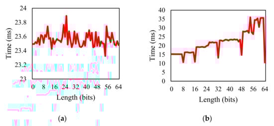The duration of this experiment examines the impact of state search/insertion time. The time required to repeatedly search/insert global variables with offset 0 bits and length 1~64 bits is tested 1,000,000 times in the experiment. The time required to find the state is depicted in Figure 12a. The length of the state can be seen to be aligned with the byte less time. The time required to update the state is depicted in Figure 12b. The longer the length, the longer the time. Similarly, the time required for byte alignment is modest. For example, the time required to update a state with a length of 64 bits is less than that required to update a state with a length of 63 bits, and even less than that required to update a state with a length of 48 bits. This is due to the fact that the bit width of the CPU we use is 64 bits.