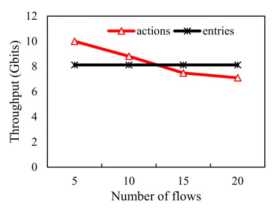 The performance of using the action comparison state improves when the number of comparison states is less than 12, as shown in Figure 14. However, as the number of comparison states grows, so does the number of executed actions, resulting in a decrease in performance. The state’s performance as a match field is consistent, which is related to the experiment’s hash-based table lookup algorithm (DPDK/librte_table/EM). Aside from performance, the two methods take up different amounts of space. When the state is a match field, every time a comparison value is added, an entry (526 bytes) is added. When using actions, each additional set of comparison forwarding actions takes up only 32 bytes of space.