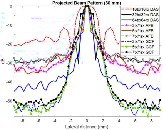 | −6 dB (mm) | 16 Tx/16 Rx DAS | 32 Tx/32 Rx DAS | 64 Tx/64 Rx DAS | 3 Tx/1 Rx AFB | 5 Tx/1 Rx AFB | 7 Tx/1 Rx AFB | 3 Tx/1 Rx GCF | 5 Tx/1 Rx GCF | 7 Tx/1 Rx GCF |
