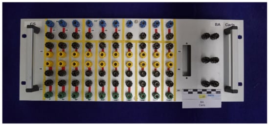 For the investigation of the cylindrical specimens, an advanced test setup was developed based on the existing equipment. Therefore, as the first step, a breadboard (see Figure 1) was configured, including the LCR meter, which was directly connected to the different electrodes. With this approach, it was possible to analyse the electrical resistivity, which was calculated from the electrical resistance and the dimensions of the specimens in different directions inside the specimens.