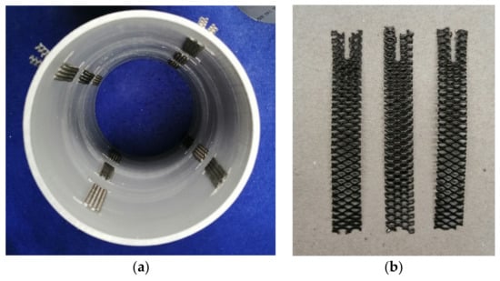 PVC formwork with 12 MMO grid electrodes at three height levels with angular distances of 90° (a) and MMO grid electrodes with notches for the clamp (b).