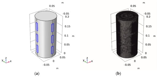 The model consists of a cylinder with a diameter of 100 mm and a height of 200 mm and represents the concrete specimen. On the surface, there are 12 electrodes at three height levels, 4 on each level, in circular distances of 90° and with a thickness of 1 mm. Each electrode has an area of 40 × 10 mm2 and is simulated as a segment of a circle to enable optimal connection to the cylinder. In this way, the model can be used for various electrode configurations. The FEM model of the test setup is presented in Figure 3a and the resulting grid model for a 12-electrode configuration can be seen in Figure 3b. The model presented was set up using the following assumption: the concrete and steel domain are considered to show homogeneous and isotropic behaviour and the sponge cloths as well as the polarization behaviour of the steel electrodes can be neglected. The latter is considered to be a valid assumption for the alternating current (AC) measurements using the parameters stated above.