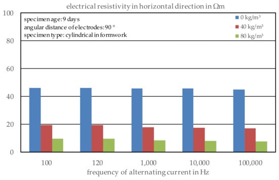 To identify effects based on the specimen’s direction, the age of the specimen and the number of electrodes inside the specimen, the calculated resistivity of the concrete, based on a measurement with an alternating current frequency of 1 kHz, was used throughout the study. With this approach, we were able to exclude polarisation and induction effects. Afterwards, the results of all frequencies were evaluated according to Section 2.4 to estimate the fibre content and the orientation of fibres inside the specimen.