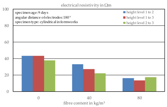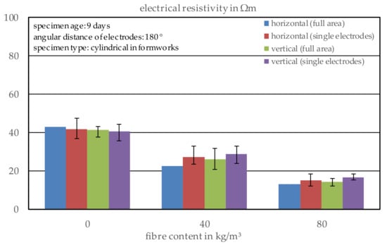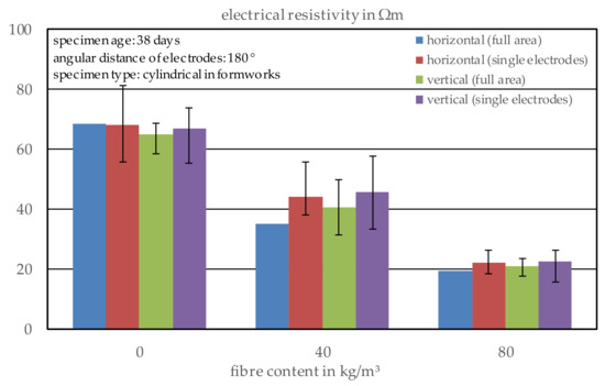 The results of the three specimens with an electrode array of only six electrodes with angular distances of 180° show that a higher fibre content results in a lower electrical resistivity of the composite material (see Figure 6), which is in line with several studies (see, e.g., [30,39,40,41]). This behaviour is the same for every direction that was analysed within this study. In the horizontal direction, the maximum area that was possible to analyse was investigated using a parallel connection of the electrodes at all three height levels on each side of the specimen (blue column). Compared to the measurements of single electrodes in the horizontal direction (red column) which means that the electrical resistance between both electrodes at height level one, level two and level three was measured, there is almost no difference in the electrical resistivity of the plain concrete, while for the fibre reinforced concretes, higher differences were observed. This can be explained by the inhomogeneity of the concrete and fibres and the anisotropy of the fibres, which are of a higher consequence if a smaller volume of materials is analysed.