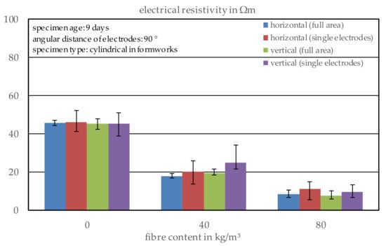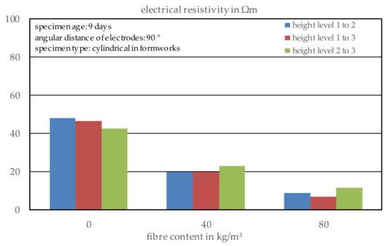 The second series of three specimens was produced with four electrodes at each height level, corresponding to angular distances of 90° and so, more electrode arrays for the measurement were possible (see Figure 8 and Figure A1 in Appendix A). According to the investigations described above, the electrical resistivities in the horizontal and vertical direction were determined too. For the plain concrete, it is again visible that the electrical resistivity in both directions is almost identical, while for the fibre reinforced concrete, especially with a fibre content of 40 kg/m3, the resistivity in the vertical direction is higher than that in the horizontal direction. For the specimens with a higher fibre content, this phenomenon is not visible at the age of 9 days, while at a specimen age of 38 days, the maximum values of the resistivity in the vertical direction are at least higher than those in the horizontal direction. Nevertheless, based on the higher fibre content, a more three-dimensional fibre distribution and orientation can occur and so, the differences in the horizontal and vertical directions will be exalted at medium fibre contents, such as 40 kg/m3.