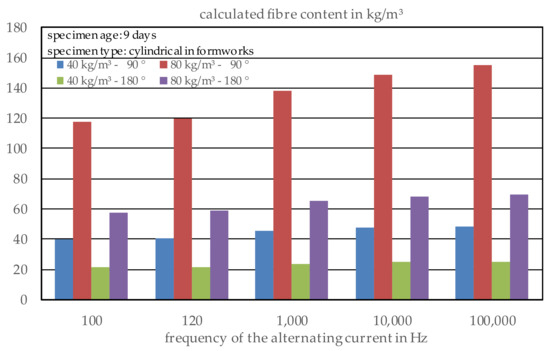 As can be seen in Figure 11, the calculated fibre contents for both electrode arrays were not satisfactory. Only in two cases was a good estimation possible. The first case was an electrode array with angular distances of 180° for a fibre content of 40 kg/m3 and low frequencies of the alternating current. The second case was an electrode array with angular distances of 90° for a fibre content of 80 kg/m3 and high frequencies of the alternating current. In all other cases, the calculated results did not correspond to the produced concrete. It is obvious that the fibre content is underestimated by the array with more electrodes, while the concrete with 80 kg/m3 is strongly overestimated by the array with angular distances of 180°. Independent of fibre content and electrode array, the frequency of the alternating current showed an effect on the calculated results, where a higher frequency resulted in a higher fibre content. This is because without knowing the phase angle of the impedance, which cannot be detected with this test setup, it is not possible to determine the real part of the impedance and thus, based on those results, it is not possible to evaluate the possibility of determining the fibre content via the electrical conductivity. For a higher specimen age, the tendency is almost the same, while all calculated fibre contents are increased by 5 to 15% (see Figure A6 in Appendix A), the electrode array with angular distances of 90° provides a large discrepancy between the results and expectations and the results become better fitting for the other electrode array.