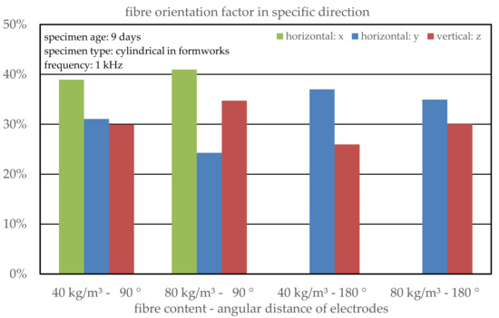 It was presumed that SFRC compacted by a vibrating table would show a higher number of fibres oriented in the horizontal direction than the vertical and, as Figure 12 shows, the calculations absolutely support this expectation for an alternating current frequency of 1 kHz, except for the specimen with 80 kg/m3 of fibres and an electrode array with angular distances of 90°. Changes in the frequency did not lead to any important changes in the results. For most of the specimens, at a specimen age of 9 days, the calculation orientation factor in the horizontal direction was lower than that in the vertical direction. For the specimens with an electrode array of electrodes with angular distances of 90° it was observed that one horizontal direction always provided the highest calculated orientation and the other horizontal direction provided the lowest, while the vertical direction had an orientation factor of about 30–35%. For the specimens with angular distances of 180°, high orientation factors for the horizontal direction of more than 35% were calculated. This could confirm the expectations but could also be a random result, because only one horizontal direction was investigated and, as the results of the investigations with more electrodes show, one horizontal direction could have very high orientation factors.