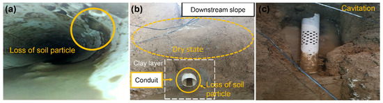 In Case 1—Crack, soil loss was observed at the outlet and inside the conduit, as shown in Figure 3a, indicating no resistance to erosion. The downstream slope was slightly dry, as shown in Figure 3b. This dry state indicates that the soil and water in the embankment zone were flowing within the conduit through its cracked area. Therefore, the seepage water did not reach the downstream slope, and the downstream slope remained dry. In Figure 3c, it can be observed that cavitation occurred due to erosion in the clay layer near the crack in the conduit. In this experiment, the cause of cavitation is considered to be the erosion of clay particles into the conduit cracks. It is assumed that the initially formed small cavitation gradually expanded into the left and right fill zones and the upper soil layer as erosion progressed.