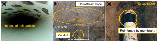 In the condition reinforced by a geomembrane (Case 1—Reinforcement), no soil loss or erosion occurred inside or outside the conduit, as shown in Figure 4a,b. However, a wide wet area in a loose state was observed on the downstream slope, as shown in Figure 4b. This indicates that the seepage line inside the embankment was formed on the top of the clay layer. These results show that the clay layer was functioning normally, but it should be noted that over a long period of time, structural defects occurred in the conduit, and a potential failure might form in the downstream slope.