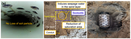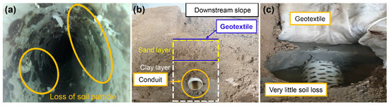 Crack conditions in the improved model (Case 2—Crack): (a) modest loss of soil particles in the conduit, (b) sand and geotextile layers in the downstream slope, and (c) minimal soil loss near the conduit-filling zone.