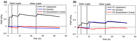 In Case 2—Crack, the pore water pressure trends on both the upstream side (P1) and downstream side (P3) were similar to those of Case 1—Crack, but only the pore water pressure (P2) at the center side increased. The increase in the central pore water pressure (P2) indicates that water leakage is induced by the sand layer and geotextile installed on the downstream slope.