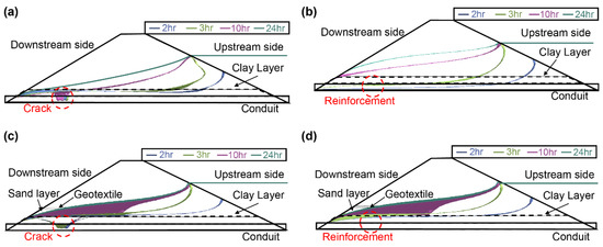 In Case 1—Crack (Figure 8a), the seepage line had a concave shape and was concentrated in the crack area of the conduit. This concave shape of the seepage line means that the leakage occurred in the conduit crack area and is considered a condition in which internal erosion can easily occur. Case 1—Reinforcement (Figure 8b) is a condition in which the crack area of the conduit is reinforced by the geomembrane, and the seepage line indicates a stable state, with the embankment functioning normally.