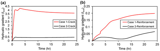 Time histories of variations in hydraulic gradients under (a) crack and (b) reinforcement conditions.