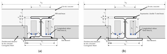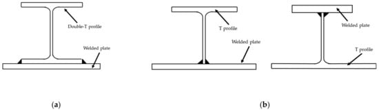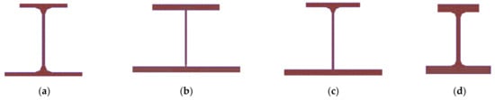 Other asymmetrical double-T steel beams can be realized by direct manufacturing (ASB type, Figure 3a) [], by welded plates (Figure 3b), or by reducing the width of the top flange of a European H-profile (SB type, Figure 3d).