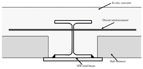 A common and economical slim floor beam configuration was developed by ArcelorMittal in the 1990s, consisting of a double-T profile with a welded plate underneath (SFB, slim floor beam) or of an asymmetric double-T profile with the bottom flange wider than the upper flange (IFB, integrated floor beam), as shown in Figure 1 []. The composite behavior is ensured by a concrete dowel, placed perpendicular to the steel profile web and embedded in the concrete poured in situ (Figure 2).