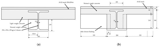 Figure 4a shows the cross-section of the WFRC 44174 composite behavior test, with a 254 × 254 mm, S275 steel profile, and the upper part embedded in a Grade 30 light weight concrete slab. The bottom part of the steel profile was covered with Grade 30 normal weight concrete, and the lower flange remained exposed. The tensile test made on a material sample taken from the tested steel profile showed a value of 267 N/mm2 for the yield strength.