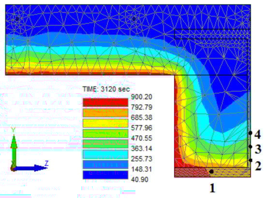 The temperature variation on the cross-section was analyzed in the same points where the thermocouples were placed during the experimental test. The article presents the comparison in the points where the temperature was reaching important values i.e., above 400 °C. Figure 5 and Figure 6 present the points where the temperatures obtained through the numerical simulation were compared with the values recorded during the experimental model. The points were chosen in the lower part of the steel profile as follows: point 1 was considered at a quarter of the bottom flange length, point 2 at 10 mm on the web height, and points 3, 4 at 30 mm and 50 mm above the bottom flange, respectively.