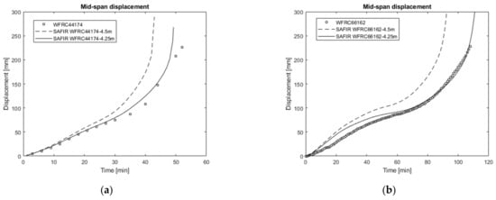 A possible explanation for the conservative results may be related to the support conditions within the experimental set-up, as the supports were outside the oven, and the assembly was part of its roof. This means that the oven walls might have interfered with the specimen during the test. Therefore, a second numerical analysis was made, in which the support conditions were simulated by considering a reduced span length of 4.25 m. A very good fit was obtained, in terms of both displacement and failure time, as shown in Figure 8. The assumption of the reduced span does not influence the validation of the numerical model, which was proved to be suitable by providing similar time-displacement evolutions and conservative failure times, considering the initial span of 4.5 m mentioned in the experimental report [,].