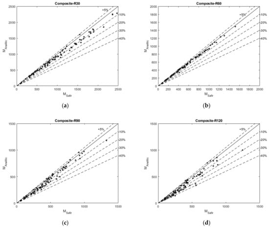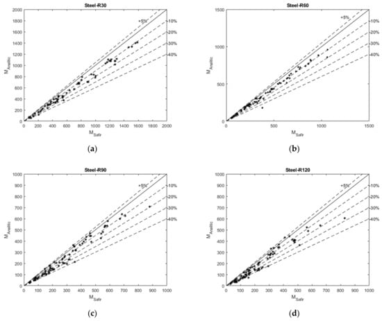 The simplified method has been applied in all 648 cases. The results obtained analytically were compared against the numerical results, in terms of bending resistance, for composite (Figure 10 and Figure 11) and non-composite behavior (Figure 12 and Figure 13). Figure 10 shows the comparison of composite behavior configurations, for R30 (a), R60 (b), R90 (c), and R120 (d), respectively. Figure 12 shows the comparison of non-composite behavior configurations, for R30 (a), R60 (b), R90 (c), and R120 (d), respectively.