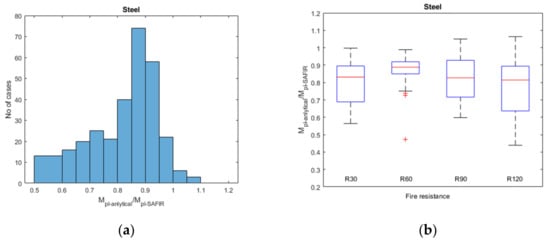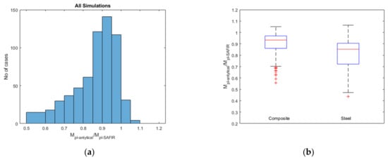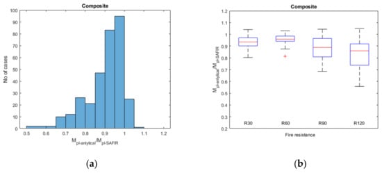 The ratio between the bending resistance computed with the simplified method and the values obtained with SAFIR is analyzed in Figure 11, for composite behavior and in Figure 13, for non-composite behavior, respectively, while Figure 14 shows the results of all situations. Figure 11a, show the Gaussian curve of the studied data, and Figure 11b, Figure 13b and Figure 14b show a boxplot assessment. It can be noted from Figure 14b that the median value of the data is 0.933, for composite behavior cases and 0.853, for non-composite behavior. The first quartile is 0.86 (25% of the values are below 0.86), for composite behavior and 0.722 for non-composite behavior cases. The third quartile is 0.97 (75% of the values are below 0.97), for composite behavior, and 0.905 for non-composite behavior. For 95% of cases (613 configurations) the simplified method offered a ratio less or equal to 1. For the remaining 5% of cases (35 configurations), the computed bending moment was higher than that obtained with SAFIR, with a maximum ratio of 1.05.