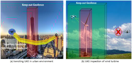 - Stevens, M.N.; Rastgoftar, H.; Atkins, E.M. Specification and evaluation of geofence boundary violation detection algorithms. In Proceedings of the IEEE 2017 International Conference on Unmanned Aircraft Systems (ICUAS), Miami, FL, USA, 13–16 June 2017; pp. 1588–1596. [Google Scholar]