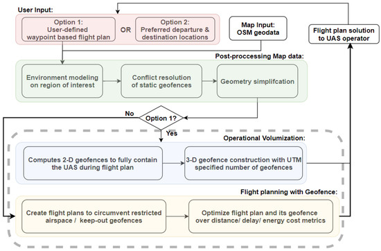 Dynamic airspace volumization for geofencing will enhance safety by wrapping a UAS in an airspace volume that assures separation from other traffic. The below subsections describe our geofencing algorithm pipeline for UTM, where flight plans are designed with keep-in/keep-out geofencing volumes on a low-altitude airspace map. Three-dimensional trajectory keep-in geofence volumes safely wrapping UAS flight paths are described in Section 3.1, keep-out geofence construction for a low-altitude urban map is described in Section 3.2, and geofence-based path planning solutions are illustrated in Section 3.3.