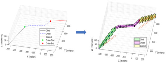 Operational volumization constructs a trajectory keep-in geofence overlaid on a user-defined 3-D flight trajectory. Climb and descent segments are first generated with vehicle dynamics inputs such as velocity and desired time to climb/descend. Then, three-dimensional cruise operational volumes are created between the climb and descent geofence pair. This assures a geofence volume always encloses the flight trajectory with the prescribed safety buffer . This algorithm integrates 2-D flight trajectory operational volumization with the Multiple Staircase Geofence (MSG) algorithm per [13]. Three-dimensional trajectory volumization is shown in Algorithm 1. Figure 3 shows an example of a 3-D trajectory with its corresponding three-dimensional geofence volume. A sequence of geofence volumes is constructed by connecting climb, cruise, and descent geofences with user-specified safety buffers.