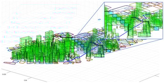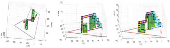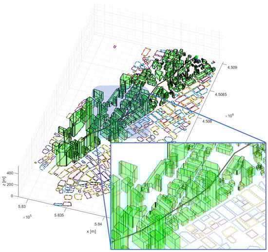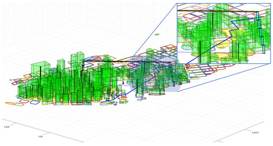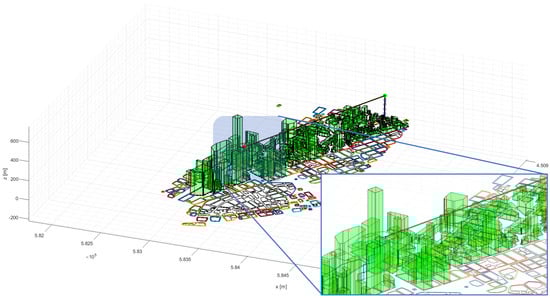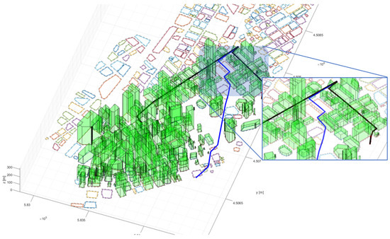 Example of a 3-D geofence wrapping a “terrain follower” flight plan for . The trajectory is shown in black, and the trajectory is shown in blue. Polyhedra (green) denote keep-out geofences around buildings. The remaining 2-D polygons denote keep-out geofences around buildings that are outside the combined ROI.