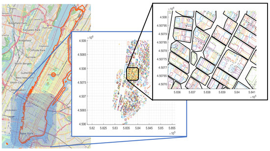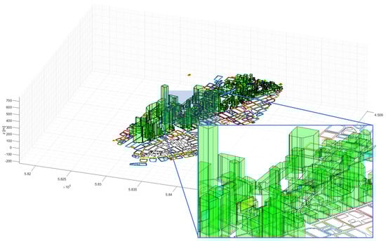 Figure 8 shows a map of southern Manhattan with closely spaced building clusters each enclosed by a single keep-out geofence to simplify the Manhattan urban canyon map. Figure 9 shows an example of post-processed georeferenced data and its 3-D keep-out geofence.