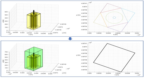 Post-processed georeferenced data for the One World Trade Center building in Manhattan. The top left and right show raw OSM data side and top views, respectively. The bottom left and right show post-processed keep-out geofence data (shaded in green) side and top views, respectively.
